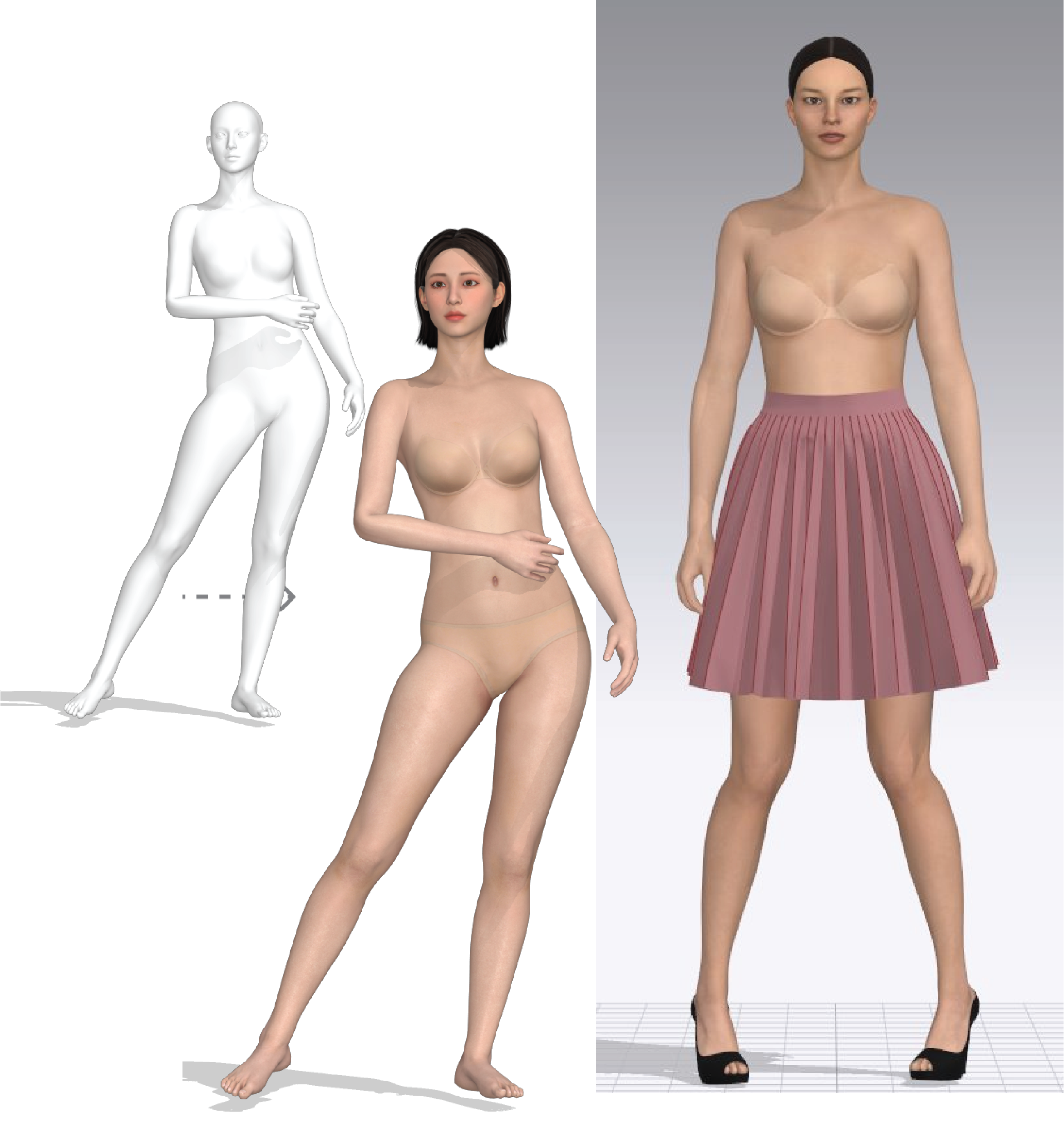 A three-piece virtual runway collection of your designs using one 3D model